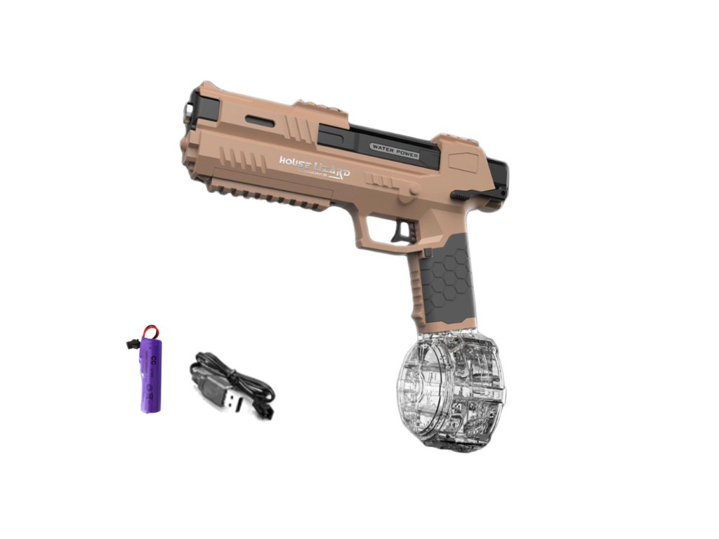 Tato automatická vodní pistole je moderní hračka, která spojuje eleganci s funkčností. Stylová světle hnědá barva jí dodává sofistikovaný vzhled, který zaujme mezi ostatními modely na trhu. Pistole je vyrobena z pevného a kvalitního materiálu, který zaručuje odolnost a sílu, přitom je lehká a pohodlná na používání.